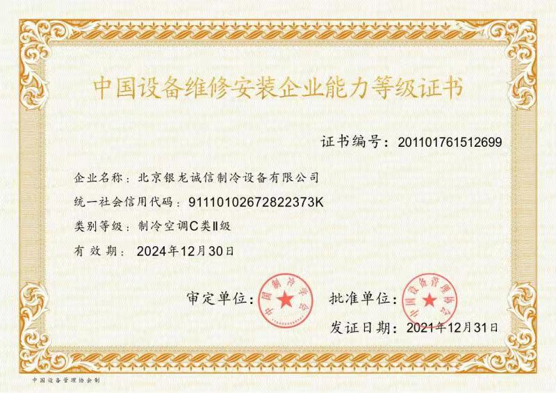 2007年:獲準(zhǔn)成為北京市制冷行業(yè)技術(shù)學(xué)會理事單位; 2009年:獲得北京市大興區(qū)百強企業(yè)認證; 2009年:獲得國家高新技術(shù)企業(yè)認證; 2011年:獲北京市安全生產(chǎn)先進企業(yè)稱號,節(jié)能環(huán)保先進單位; 2012年:通過了國家高新技術(shù)企業(yè)復(fù)審; 2013年:公司董事長獲"2013北京先進企業(yè)家"榮譽稱號; 2014年:獲2014年度中國冷庫工程安裝設(shè)計造價行業(yè)十大品牌;
